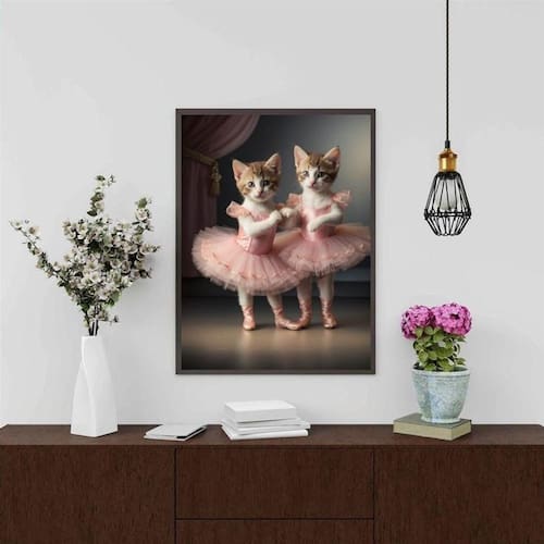 Quadro decorativo gatinhas bailarinas 45x34cm Cor: moldura branca Informações do produto tire todas as suas dúvidas no descritivo abaixo: decoração para quarto, sala, cozinha, escritório, área gourmet e muito mais. Chega de paredes vazias. Medidas - cada peça tem 45x34cm a3 . Material do papel - papel fotográfico brilhante de altíssima resolução acabamento - todos os quadros são acompanhados de uma película de acetato para proteção da imagem. - os quadros são embalados de forma segura com plástico bolha com camada dupla de acordo com o tamanho dos quadros. Garantia - garantia de 3 meses. Meu quadro chegou. Como posso fixá-lo Você precisa apenas de um martelo e um prego, pois os quadros já vão acompanhados de penduradores. Esta é a forma mais indicada. Caso prefira, você pode utilizar uma fita dupla face neste caso, sugerimos de alta qualidade para evitar que descole e seu quadro caia . Como posso limpar meu quadro A limpeza é feita como um móvel comum da sua casa. Apenas um pano seco ou espanador são suficientes para tal