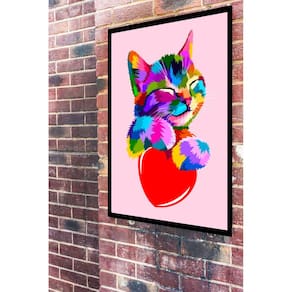 Quadro Decorativo Gatinho Colorido Coração Rosa - 70x50cm - Cor: Moldura Preta