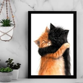 Quadro decorativo gatinhos abraçados 45x34cm - com vidro Cor: moldura branca Informações do produto tire todas as suas dúvidas no descritivo abaixo: decoração para quarto, sala, cozinha, escritório, área gourmet e muito mais. Chega de paredes vazias medidas - cada peça tem 45x34cm a3 . Material do papel - papel fotográfico brilhante de altíssima resolução acabamento - todos os quadros são acompanhados de vidro para proteção da imagem. - moldura em madeira maciça na cor preta ou branca conforme produto escolhido e pendurador . - os quadros são embalados de forma segura com plástico bolha com camada dupla de acordo com o tamanho dos quadros. Garantia - garantia de 3 meses. Meu quadro chegou. Como posso fixá-lo Você precisa apenas de um martelo e um prego, pois os quadros já vão acompanhados de penduradores. Esta é a forma mais indicada. Como posso limpar meu quadro A limpeza é feita como um móvel comum da sua casa. Apenas um pano seco ou espanador são suficientes para tal