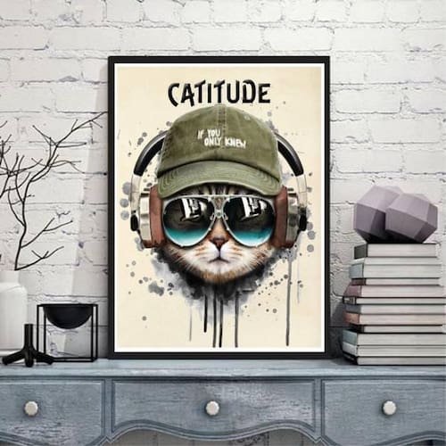 Quadro decorativo gato catitude 24x18cm Moldura: madeira preta Informações do produto tire todas as suas dúvidas no descritivo abaixo: decoração para quarto, sala, cozinha, escritório, área gourmet e muito mais. Chega de paredes vazias medidas - cada peça tem 24x18cm a5 . Material do papel - papel fotográfico brilhante de altíssima resolução acabamento - todos os quadros são acompanhados de uma película de acetato para proteção da imagem. - moldura em madeira maciça na cor preta e pendurador móvel que pode ser retirado facilmente caso deseje fixar com fita dupla face. - os quadros são embalados de forma segura com plástico bolha com camada dupla de acordo com o tamanho dos quadros. Ean: 7892091106807