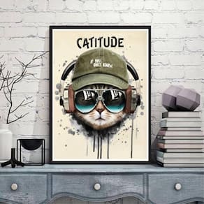 Quadro decorativo gato catitude 33x24cm - com vidro Moldura: madeira preta Informações do produto tire todas as suas dúvidas no descritivo abaixo: decoração para quarto, sala, cozinha, escritório, área gourmet e muito mais. Chega de paredes vazias medidas - cada peça tem 33x24cm a4 . Material do papel - papel fotográfico brilhante de altíssima resolução acabamento - todos os quadros são acompanhados de vidro para proteção da imagem. - moldura em madeira maciça na cor preta e pendurador . - os quadros são embalados de forma segura com plástico bolha com camada dupla de acordo com o tamanho dos quadros. - de 3 meses. Meu quadro chegou. Como posso fixá-lo Você precisa apenas de um martelo e um prego, pois os quadros já vão acompanhados de penduradores. Esta é a forma mais indicada. Como posso limpar meu quadro A limpeza é feita como um móvel comum da sua casa. Apenas um pano seco ou espanador são suficientes para tal Ean: 7895142248969