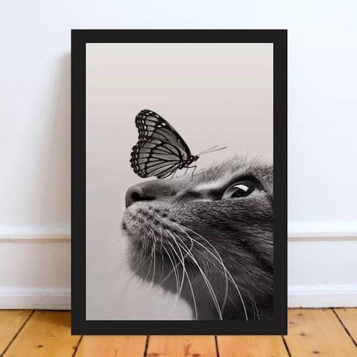 Quadro decorativo gato com borboleta 33x24cm - com vidro Moldura: madeira preta Informações do produto Decoração para quarto, sala, cozinha, escritório, área gourmet e muito mais. Chega de paredes vazias medidas - cada peça tem 33x24cm a4 . Material do papel - papel fotográfico brilhante de altíssima resolução Acabamento - todos os quadros são acompanhados de vidro para proteção da imagem. - Moldura em madeira maciça na cor preta e pendurador . - Os quadros são embalados de forma segura com plástico bolha com camada dupla de acordo com o tamanho dos quadros. Garantia - garantia de 3 meses. Meu quadro chegou. Como posso fixá-lo Você precisa apenas de um martelo e um prego, pois os quadros já vão acompanhados de penduradores. Esta é a forma mais indicada. Como posso limpar meu quadro A limpeza é feita como um móvel comum da sua casa. Apenas um pano seco ou espanador são suficientes para tal