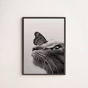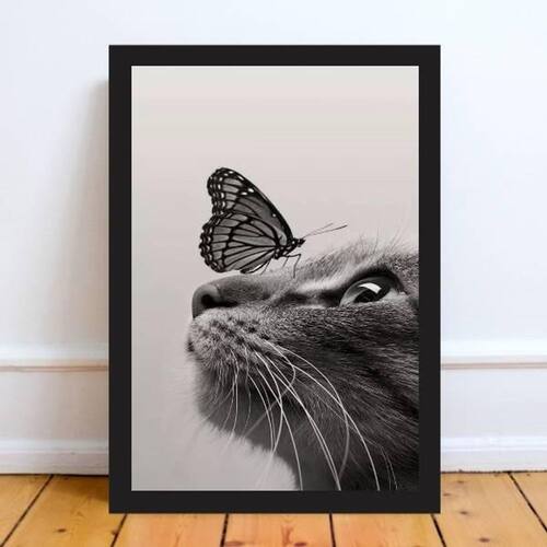Quadro decorativo gato com borboleta 33x24cm - com vidro Moldura: madeira preta