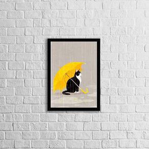Quadro Decorativo Gato com Sombrinha Amarela 45x34cm - com vidro - Moldura: Madeira branca