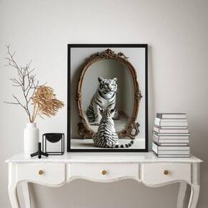 Quadro decorativo gato espelho tigre 24x18cm - com vidro Cor: moldura branca Informações do produto tire todas as suas dúvidas no descritivo abaixo: decoração para quarto, sala, cozinha, escritório, área gourmet e muito mais. Chega de paredes vazias medidas - cada peça tem 24x18cm a5 . Material do papel - papel fotográfico brilhante de altíssima resolução acabamento - todos os quadros são acompanhados de vidro para proteção da imagem. - moldura em madeira maciça na cor preta ou branca conforme produto escolhido e pendurador . - os quadros são embalados de forma segura com plástico bolha com camada dupla de acordo com o tamanho dos quadros. - de 3 meses. Meu quadro chegou. Como posso fixá-lo Você precisa apenas de um martelo e um prego, pois os quadros já vão acompanhados de penduradores. Esta é a forma mais indicada. Como posso limpar meu quadro A limpeza é feita como um móvel comum da sua casa. Apenas um pano seco ou espanador são suficientes para tal