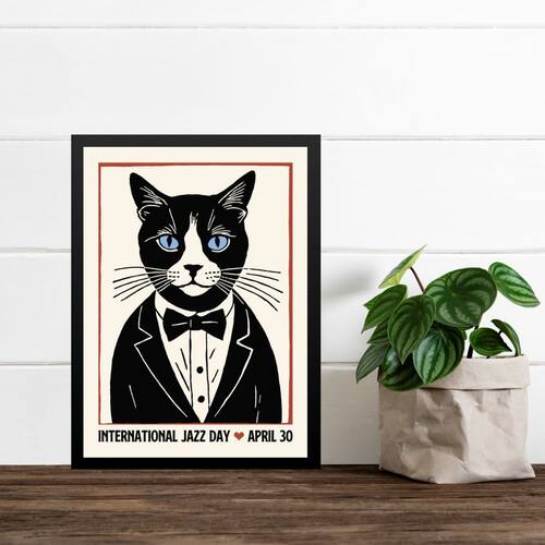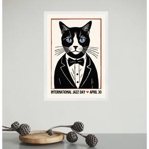 Quadro Decorativo Gato - Jazz Day 45x34cm - Cor: Moldura preta