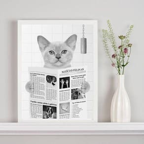 Quadro decorativo gato lendo jornal no banheiro 45x34cm