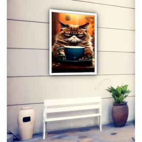 Quadro Decorativo Gato Mal-Humorado Café - 70x50cm - Cor: Moldura Branca