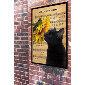 Quadro Decorativo Gato Preto Girassol Sunchine - 70x50cm - Cor: Moldura Preta