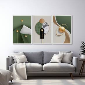 Quadro Decorativo Geométrico Formas Abstratas com 3 Telas de Parede para Sala Quarto Escritório 60cm Branco