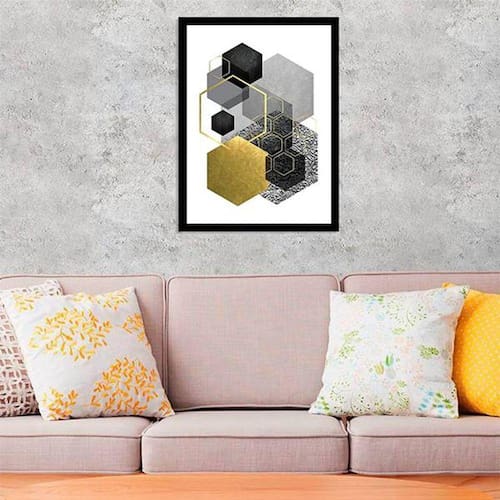 Quadro Decorativo Geométrico Hexágonos Cinza e Preto - Tamanho: A4 (20 x 30) / Acabamento: Película de acetato / Moldura: Madeira preta