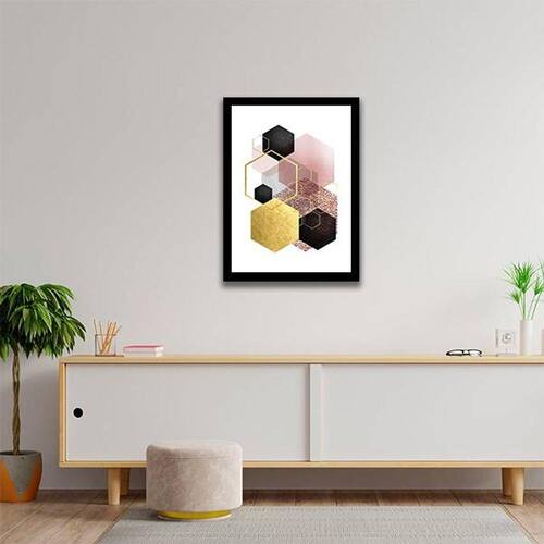 Quadro Decorativo Geométrico Hexágonos Preto e Dourado - Tamanho: A4 (20 x 30) / Acabamento: Película de acetato / Moldura: Madeira preta
