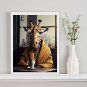 Quadro decorativo girafa tomando café 33x24cm Moldura: madeira preta Informações do produto tire todas as suas dúvidas no descritivo abaixo: decoração para quarto, sala, cozinha, escritório, área gourmet e muito mais. Chega de paredes vazias medidas - cada peça tem 33x24cm a4 . Material do papel - papel fotográfico brilhante de altíssima resolução acabamento - todos os quadros são acompanhados de uma película de acetato para proteção da imagem. - os quadros são embalados de forma segura com plástico bolha com camada dupla de acordo com o tamanho dos quadros. Garantia - garantia de 3 meses. Meu quadro chegou. Como posso fixá-lo Você precisa apenas de um martelo e um prego, pois os quadros já vão acompanhados de penduradores. Esta é a forma mais indicada. Caso prefira, você pode utilizar uma fita dupla face neste caso, sugerimos de alta qualidade para evitar que descole e seu quadro caia . Como posso limpar meu quadro A limpeza é feita como um móvel comum da sua casa. Apenas um pano seco ou espanador são suficientes para tal Ean: 7894908996755