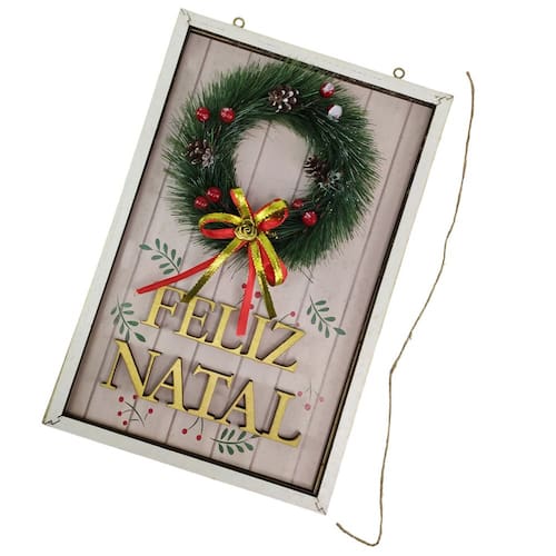 Design Encantador: O quadro apresenta a mensagem "Feliz Natal" delicadamente ornamentada com uma guirlanda festiva.