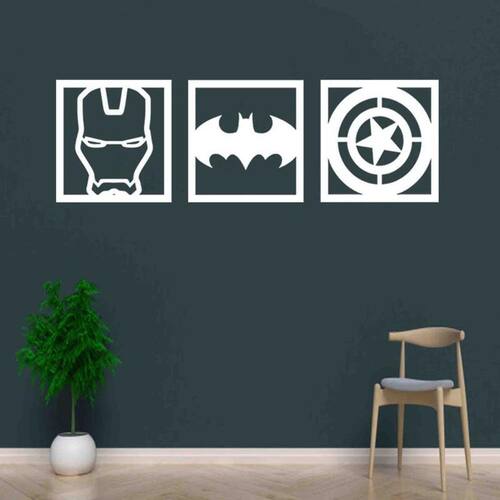 Quadro Decorativo Herois 3Mm Vazado Branco - Mdf Cor: branco Tamanho & instalação: Tamanho total: 92cm comprimento x 30cm altura com espaçamento recomendado de 1 cm entre peças, Peças laterais: 30x30 cm | peça central: 30x30 cm Espaçamento entre as peças: 1 cm A instalação é bem simples, não será preciso fazer sujeira furando a parede pois utilizamos o método bem prático para instalar, contém fita dupla face 3m no verso do quadro.