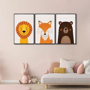 Quadro Decorativo Infantil Amigos da Selva com 3 Telas cm ou cm de Parede para Quarto, Sala, Brinquedoteca, Escola, Creche, Sala de Jogos, Hall, Salão de Festas.Especificações Técnicas:Modelo: Amigos da Selva;Material da Imagem: Papel premium fotográfico de alta qualidade;Material da Moldura: Madeira de reflorestamento revestida;Espessura da Moldura: 2,7cm de profundidade e 1,5cm frontal;Medidas: cm e cm;Acabamento: Fita Kraft;Acompanha: Suporte de serrilha para quadros e parafusos.Transforme seu espaço com elegância e sofisticação! Não perca a oportunidade de adquirir o exclusivo Quadro Decorativo Infantil Amigos da Selva com 3 Telas a um preço incrível!
