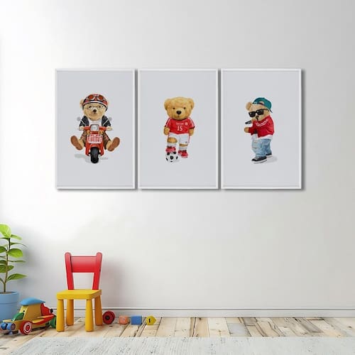 Quadro Decorativo Infantil Ursinhos Estilosos com 3 Telas cm ou cm de Parede para Quarto, Sala, Brinquedoteca, Escola, Creche, Sala de Jogos, Hall, Salão de Festas.Especificações Técnicas:Modelo: Ursinhos Estilosos;Material da Imagem: Papel premium fotográfico de alta qualidade;Material da Moldura: Madeira de reflorestamento revestida;Espessura da Moldura: 2,7cm de profundidade e 1,5cm frontal;Medidas: cm e cm;Acabamento: Fita Kraft;Acompanha: Suporte de serrilha para quadros e parafusos.Transforme seu espaço com elegância e sofisticação! Não perca a oportunidade de adquirir o exclusivo Quadro Decorativo Infantil Ursinhos Estilosos com 3 Telas a um preço incrível! Acompanha Fixação para Parede: Sim Ambiente Principal: Sala de Estar Cor: Branco Cor do Produto: Branco Espessura: 20 mm Espessura do Vidro: 3 mm Itens Inclusos: Quadro com 3 telas Marca: ARTE PRÓPRIA Material Principal: Madeira Maciça Medida de Cada Item: 60cm x 90cm Origem do Produto: Nacional Peso: 15 kg Possui Paspatur: Não Possui Vidro: Sim Tema da Estampa: Infantil Tipo de Quadro: Kit de quadros Vidro é Anti-Reflexo: Não Marca: ARTE PRÓPRIA
