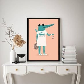 Quadro decorativo jacaré jogando tênis 45x34cm - com vidro Cor: moldura preta Informações do produto tire todas as suas dúvidas no descritivo abaixo: decoração para quarto, sala, cozinha, escritório, área gourmet e muito mais. Chega de paredes vazias medidas - cada peça tem 45x34cm a3 . Material do papel - papel fotográfico brilhante de altíssima resolução acabamento - todos os quadros são acompanhados de vidro para proteção da imagem. - moldura em madeira maciça na cor preta ou branca conforme produto escolhido e pendurador . - os quadros são embalados de forma segura com plástico bolha com camada dupla de acordo com o tamanho dos quadros. - de 3 meses. Meu quadro chegou. Como posso fixá-lo Você precisa apenas de um martelo e um prego, pois os quadros já vão acompanhados de penduradores. Esta é a forma mais indicada. Como posso limpar meu quadro A limpeza é feita como um móvel comum da sua casa. Apenas um pano seco ou espanador são suficientes para tal