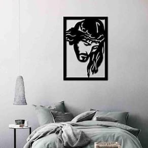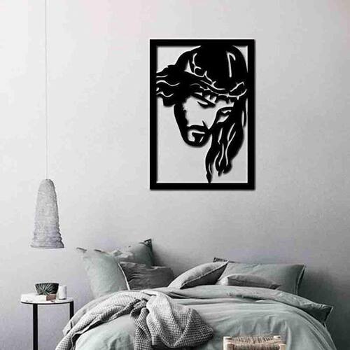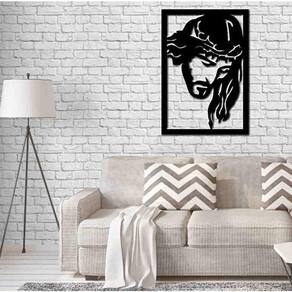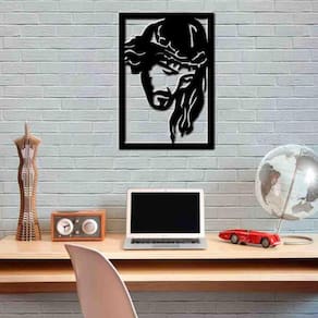 Quadro Decorativo Jesus Cristo 3Mm Vazado Preto - Mdf Cor: preto Tamanho & instalação: Tamanho total: 60cm (altura) x 40cm (comprimento) /a instalação é bem simples, não será preciso fazer sujeira furando a parede pois utilizamos o método bem prático para instalar, contém fita dupla face 3m no verso do quadro.