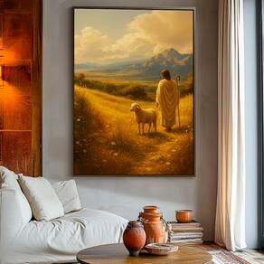 Quadro Decorativo Jesus e Cordeiro no Pasto Moldura Dourada - 118x78cm -