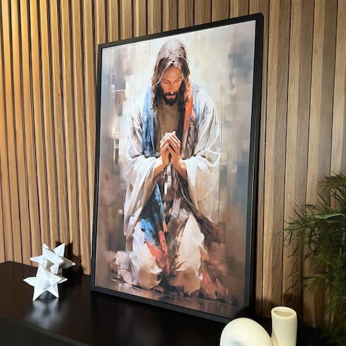 Quadro decorativo jesus em oração 45x34cm - com vidro Cor: moldura branca Informações do produto tire todas as suas dúvidas no descritivo abaixo: decoração para quarto, sala, cozinha, escritório, área gourmet e muito mais. Chega de paredes vazias medidas - cada peça tem 45x34cm a3 . Material do papel - papel fotográfico brilhante de altíssima resolução acabamento - todos os quadros são acompanhados de vidro para proteção da imagem. - moldura em madeira maciça na cor preta ou branca conforme produto escolhido e pendurador . - os quadros são embalados de forma segura com plástico bolha com camada dupla de acordo com o tamanho dos quadros. - de 3 meses. Meu quadro chegou. Como posso fixá-lo Você precisa apenas de um martelo e um prego, pois os quadros já vão acompanhados de penduradores. Esta é a forma mais indicada. Como posso limpar meu quadro A limpeza é feita como um móvel comum da sua casa. Apenas um pano seco ou espanador são suficientes para tal