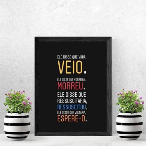 Quadro decorativo jesus está voltando 33x24cm Moldura: madeira preta Informações do produto tire todas as suas dúvidas no descritivo abaixo: decoração para quarto, sala, cozinha, escritório, área gourmet e muito mais. Chega de paredes vazias medidas - cada peça tem 33x24cm a4 . Material do papel - papel fotográfico brilhante de altíssima resolução acabamento - todos os quadros são acompanhados de uma película de acetato para proteção da imagem. - moldura em madeira maciça na cor preta e pendurador móvel que pode ser retirado facilmente caso deseje fixar com fita dupla face. - os quadros são embalados de forma segura com plástico bolha com camada dupla de acordo com o tamanho dos quadros. Marca: Não Informado Ean: 7892090541395