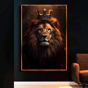 Quadro Decorativo Leão com a Coroa de Rei Moldura Dourada - 150x100cm -