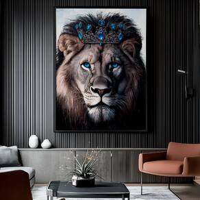 Quadro Decorativo Leão Com Coroa Azul Borda Infinita - 60x40cm -
