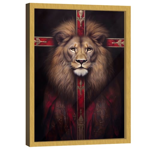 Quadro Decorativo Leão Cruz Vermelha Moldura Dourada e Vidro - 84x54cm -