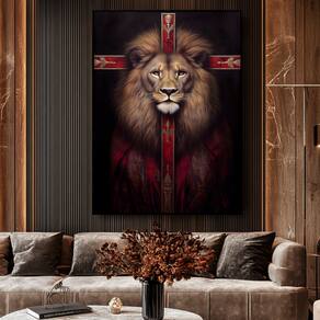 Quadro Decorativo Leão Cruz Vermelha Moldura Dourada e Vidro - 118x78cm -