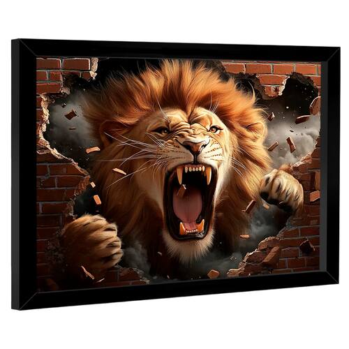 Quadro Decorativo Leão Destruindo a Parede Moldura Preta - 180x105cm -