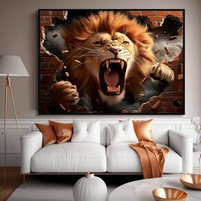 Quadro Decorativo Leão Destruindo a Parede Moldura Branca e Vidro - 84x54cm -