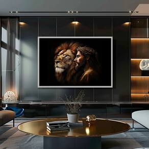 Quadro Decorativo Leão Divino e Jesus Moldura Branca - 60x40cm -