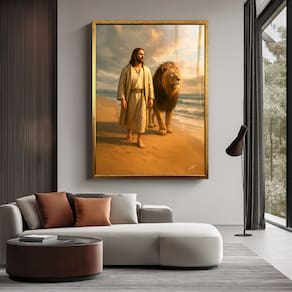 Quadro Decorativo Leão e Jesus Caminhando na Praia
