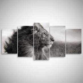 Quadro decorativo Leão em Preto e Branco Paisagem Dimensões do Produto: Tamanho total do produto: 125x60 cm Comprimento x Altura 02 Peças menores: 25x40 cm 02 Peças Médias: 25x50 cm 01 Peça Central: 25x60 cm. Espaçamento entre as peças de 1 cm - Tamanho total com espaçamentos 129x60 cm. Espessura do produto - 9 mm