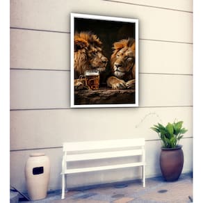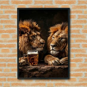 Quadro Decorativo Leões Tomando Cerveja - 70x50cm - Cor: Moldura Branca