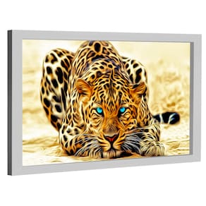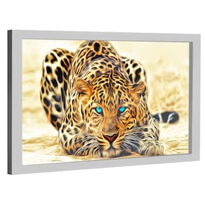 Quadro Decorativo Leopardo Olhos Azuis Moldura Branca e Vidro - 180x105cm -