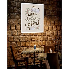Quadro decorativo life is better with coffee - 70x50cm Cor: moldura branca Informações do produto tire todas as suas dúvidas no descritivo abaixo: decoração para quarto, sala, cozinha, escritório, área gourmet e muito mais. Chega de paredes vazias medidas - cada peça tem 70x50cm . Material do papel - papel fotográfico brilhante de altíssima resolução acabamento - todos os quadros são acompanhados de vidro para proteção da imagem. - moldura em madeira maciça na cor preta ou branca conforme produto escolhido e pendurador. - os quadros são embalados de forma segura com plástico bolha com camada dupla de acordo com o tamanho dos quadros. - de 3 meses. Meu quadro chegou. Como posso fixá-lo Você precisa apenas de um martelo e um prego, pois os quadros já vão acompanhados de penduradores. Esta é a forma mais indicada. Como posso limpar meu quadro A limpeza é feita como um móvel comum da sua casa. Apenas um pano seco ou espanador são suficientes para tal Marca: Não Informado