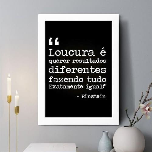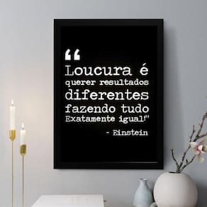 Quadro decorativo loucura - einstein 45x34cm - com vidro Cor: moldura branca Informações do produto tire todas as suas dúvidas no descritivo abaixo: decoração para quarto, sala, cozinha, escritório, área gourmet e muito mais. Chega de paredes vazias medidas - cada peça tem 45x34cm a3 . Material do papel - papel fotográfico brilhante de altíssima resolução acabamento - todos os quadros são acompanhados de vidro para proteção da imagem. - moldura em madeira maciça na cor preta ou branca conforme produto escolhido e pendurador . - os quadros são embalados de forma segura com plástico bolha com camada dupla de acordo com o tamanho dos quadros. Garantia - garantia de 3 meses. Meu quadro chegou. Como posso fixá-lo Você precisa apenas de um martelo e um prego, pois os quadros já vão acompanhados de penduradores. Esta é a forma mais indicada. Como posso limpar meu quadro A limpeza é feita como um móvel comum da sua casa. Apenas um pano seco ou espanador são suficientes para tal