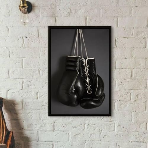 Quadro decorativo luva de boxe preta 24x18cm - com vidro Moldura: madeira preta Informações do produto Decoração para quarto, sala, cozinha, escritório, área gourmet e muito mais. Chega de paredes vazias Medidas - cada peça tem 24x18cm a5 . Material do papel - papel fotográfico brilhante de altíssima resolução Acabamento - todos os quadros são acompanhados de vidro para proteção da imagem. - Moldura em madeira maciça na cor preta e pendurador. - Os quadros são embalados de forma segura com plástico bolha com camada dupla de acordo com o tamanho dos quadros. - de 3 meses. Meu quadro chegou. Como posso fixá-lo Você precisa apenas de um martelo e um prego, pois os quadros já vão acompanhados de penduradores. Esta é a forma mais indicada. Como posso limpar meu quadro A limpeza é feita como um móvel comum da sua casa. Apenas um pano seco ou espanador são suficientes para tal