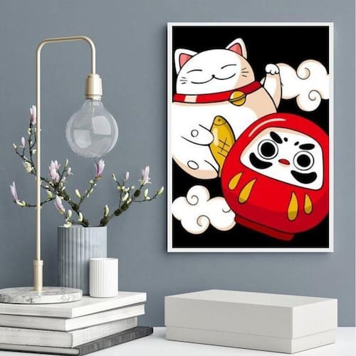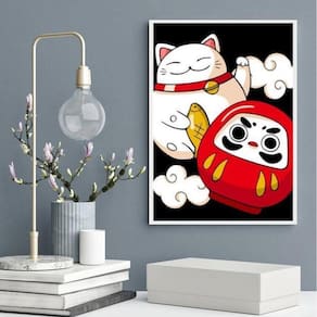 Quadro decorativo maneki neko e daruma 33x24cm - com vidro Moldura: madeira preta Informações do produto tire todas as suas dúvidas no descritivo abaixo: decoração para quarto, sala, cozinha, escritório, área gourmet e muito mais. Chega de paredes vazias medidas - cada peça tem 33x24cm a4 . Material do papel - papel fotográfico brilhante de altíssima resolução acabamento - todos os quadros são acompanhados de vidro para proteção da imagem. - moldura em madeira maciça na cor preta ou branca conforme produto escolhido e pendurador . - os quadros são embalados de forma segura com plástico bolha com camada dupla de acordo com o tamanho dos quadros. Garantia - garantia de 3 meses. Meu quadro chegou. Como posso fixá-lo Você precisa apenas de um martelo e um prego, pois os quadros já vão acompanhados de penduradores. Esta é a forma mais indicada. Como posso limpar meu quadro A limpeza é feita como um móvel comum da sua casa. Apenas um pano seco ou espanador são suficientes para tal
