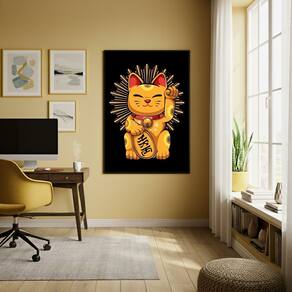 Quadro Decorativo Maneki Neko - Gato da Sorte - 70x50cm - Cor: Moldura Branca