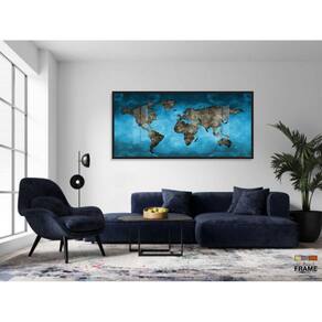 Quadro decorativo Mapa Mundi Azul Mosaico 130x60 Moldura Preta 2x2