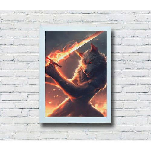 Celebre a arte em sua forma mais vibrante com nosso quadro decorativo de alta qualidade feito em MDF. Escolha entre moldura ou sem moldura, e permita que a impressão excepcional e a arte exclusiva do "Lobo com Espada Flamejante" se combinem para um impacto impressionante. Marca: I Love Be Nerd