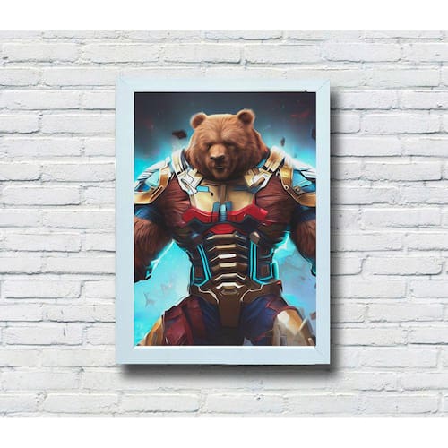 Adicione um elemento de distinção com nosso quadro decorativo de alta qualidade feito em MDF. Cores vibrantes e arte exclusiva do "Urso Guerreiro" ganham vida através da nossa impressão premium, com escolha entre moldura ou sem moldura.