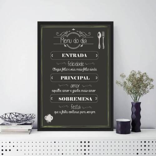 O Quadro Decorativo Menu Do Dia 33 x 24 cm A4 é perfeito para a decorar o seu ambiente de forma moderna e charmosa. O quadro é fácil de instalar pois vai acompanhado de pendurador e simples de limpar, apenas um pano seco ou espanador é suficiente para manter o seu quadro conservado. Características: - O papel fotográfico possui alta resolução - Acompanha vidro para proteção da imagem - Fácil de instalar Especificações Marca: Quadros On-Line Temática do quadro: Comida Modelo: Menu Do Dia Material do papel: Fotográfico brilhante Material da moldura: Madeira Acompanha moldura: Sim Acompanha vidro: Sim Acompanha pendurador: Sim Cor da moldura: Preta Medidas: 33 x 24 cm : 3 meses Itens inclusos 01 Quadro Decorativo Menu Do Dia 33 x 24 cm Marca: Não Informado