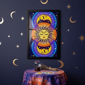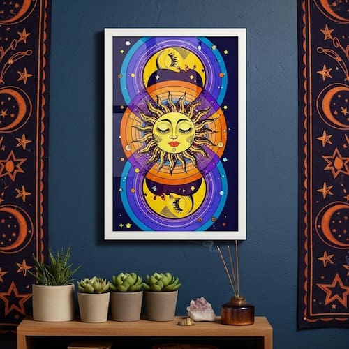 Quadro Decorativo Místico Sol e Lua - 70x50cm - Cor: Moldura Preta