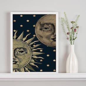 Quadro decorativo mistico sol e lua - metades 45x34cm - com vidro Cor: moldura preta Informações do produto tire todas as suas dúvidas no descritivo abaixo: decoração para quarto, sala, cozinha, escritório, área gourmet e muito mais. Chega de paredes vazias medidas - cada peça tem 45x34cm a3 . Material do papel - papel fotográfico brilhante de altíssima resolução acabamento - todos os quadros são acompanhados de vidro para proteção da imagem. - moldura em madeira maciça na cor preta ou branca conforme produto escolhido e pendurador . - os quadros são embalados de forma segura com plástico bolha com camada dupla de acordo com o tamanho dos quadros. - de 3 meses. Meu quadro chegou. Como posso fixá-lo Você precisa apenas de um martelo e um prego, pois os quadros já vão acompanhados de penduradores. Esta é a forma mais indicada. Como posso limpar meu quadro A limpeza é feita como um móvel comum da sua casa. Apenas um pano seco ou espanador são suficientes para tal