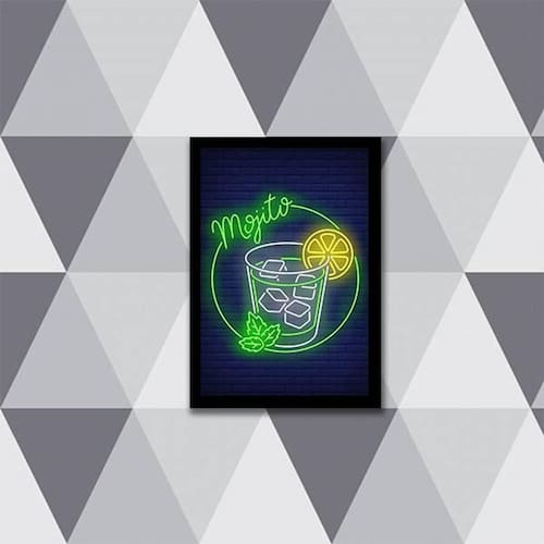 Quadro decorativo mojito simulando neon 33x24cm - com vidro Moldura: madeira preta Informações do produto tire todas as suas dúvidas no descritivo abaixo: decoração para quarto, sala, cozinha, escritório, área gourmet e muito mais. Chega de paredes vazias medidas - cada peça tem 33x24cm a4 . Material do papel - papel fotográfico brilhante de altíssima resolução acabamento - todos os quadros são acompanhados de vidro para proteção da imagem. - moldura em madeira maciça na cor preta e pendurador . - os quadros são embalados de forma segura com plástico bolha com camada dupla de acordo com o tamanho dos quadros. - de 3 meses. Meu quadro chegou. Como posso fixá-lo Você precisa apenas de um martelo e um prego, pois os quadros já vão acompanhados de penduradores. Esta é a forma mais indicada. Como posso limpar meu quadro A limpeza é feita como um móvel comum da sua casa. Apenas um pano seco ou espanador são suficientes para tal Ean: 7895142228800