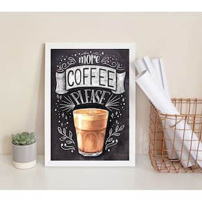 Quadro decorativo more coffee please 45x34cm - com vidro Moldura: madeira branca Informações do produto tire todas as suas dúvidas no descritivo abaixo: decoração para quarto, sala, cozinha, escritório, área gourmet e muito mais. Chega de paredes vazias medidas - cada peça tem 45x34cm a3 . Material do papel - papel fotográfico brilhante de altíssima resolução acabamento - todos os quadros são acompanhados de vidro para proteção da imagem. - moldura em madeira maciça na cor preta ou branca conforme produto escolhido e pendurador . - os quadros são embalados de forma segura com plástico bolha com camada dupla de acordo com o tamanho dos quadros. Garantia - garantia de 3 meses. Meu quadro chegou. Como posso fixá-lo Você precisa apenas de um martelo e um prego, pois os quadros já vão acompanhados de penduradores. Esta é a forma mais indicada. Como posso limpar meu quadro A limpeza é feita como um móvel comum da sua casa. Apenas um pano seco ou espanador são suficientes para tal Ean: 7898610649312